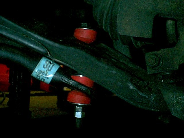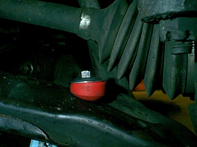 After you are done with the frame mounting aspect of this install, holes will need to be drilled in the lower control arms just rearward of the CV shaft centerline as shown below for the end links. Be sure that the sway bar is centered between the wheels at this time. The marking of the location of these holes should be made after the sway bar is securely mounted in place, centered, and the suspension is fully loaded so that the end links will stand almost vertical. Allow the proper clearance for the components of the end links when marking your holes. (I.E. make sure the sway bar is moved far enough below the control arm so you can fit the end link parts in between)