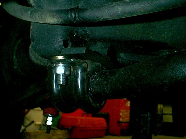 Depending on the type of bushing you have, you may need to install the 3/8" flat washers (2 or 3 per bolt) between the brackets and subframe as shown below. This may be necessary to make sure the bushing is not too tight on the sway bar.